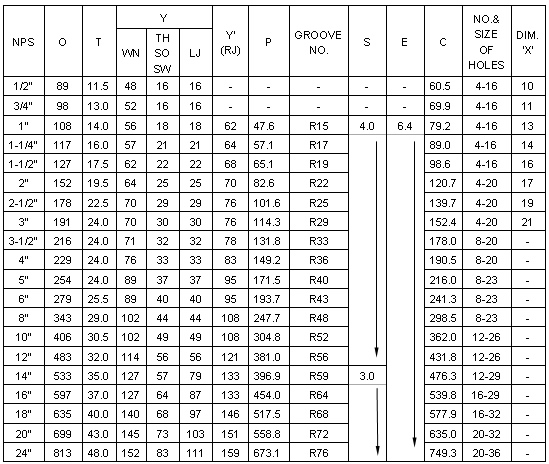 NOTES:1.MATERIALA SEE JOB MATERIAL SPEC 2.ALL DIMENSIONS ARE BASED ON ASME B16.5 3.GROOVE NO.R30 FOR LAPPED JOINT FLANGE ONLY 4.DIMENSIONS SHOWN ARE IN MILLIMETERS